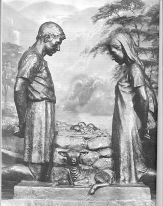 In the statue, Adam and Eve are portrayed kneeling across the a sacrificial stone altar from each other. Placed upon the altar is a sacrifice of grains, fruits and vegetables, or in other words, the "fruit of the ground." Lying so peacefully at their side during this sacrifice, seemingly without any worry, is a young lamb.