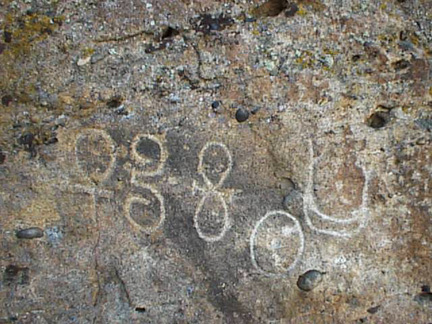 These hieroglyphs may indeed be several thousand years old, predating the Fremont Indian culture. It is interesting to note that these characters are located on the hill directly east of the Temple hill, with the temple itself in full view. To improve their visibility for the photographs, chalk was applied to make them stand out more. When they were originally discovered less than ten years ago, they were covered with lichens.