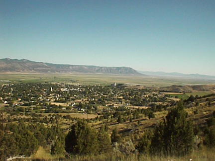 Manti City and the surrounding valley, as viewed from the South looking North. The Manti Temple can be seen in the center at the North edge of town. The Steeple of the old Manti Tabernacle can be seen in the left center part of the photo. The TLC Church offices are located across the street from the Tabernacle a few doors to the North, on the East side of the street. 37 South Main St.
